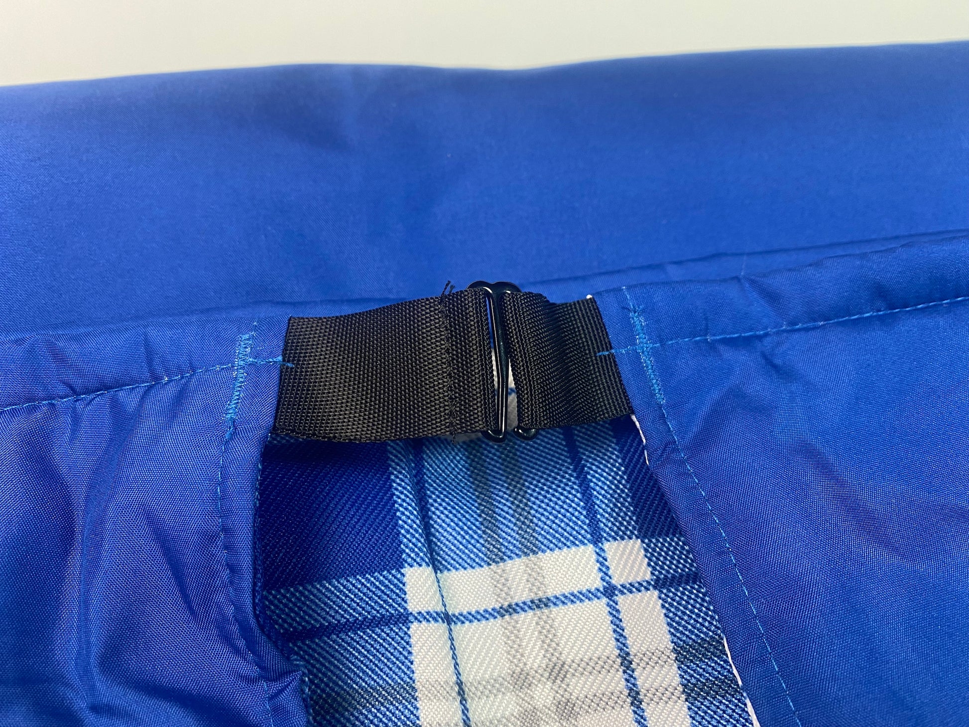 Foot pocket keeps your feet warm and dry and holds your blanket in place in bad weather. Hooks in the corners keep the blanket wrapped snugly around your legs and shoulders. Luxurious for one, and large enough for two.
